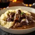 A hearty dish of tender beef tips in rich gravy over creamy mashed potatoes, perfect for family dinners and cozy nights.