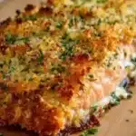 A delightful dish featuring salmon coated with a crispy Parmesan crust, perfect for family dinners or gatherings.