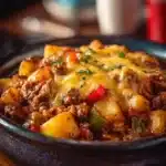 Yes, you can cook this on the stovetop if you don’t have a slow cooker. Simply brown the meat and onion in a large pot, then add the remaining ingredients. Cover and simmer on low for about 30-45 minutes, stirring occasionally until the potatoes are tender.