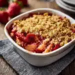 A delightful dessert that combines tart rhubarb with sweet strawberries, topped with a crunchy crisp.